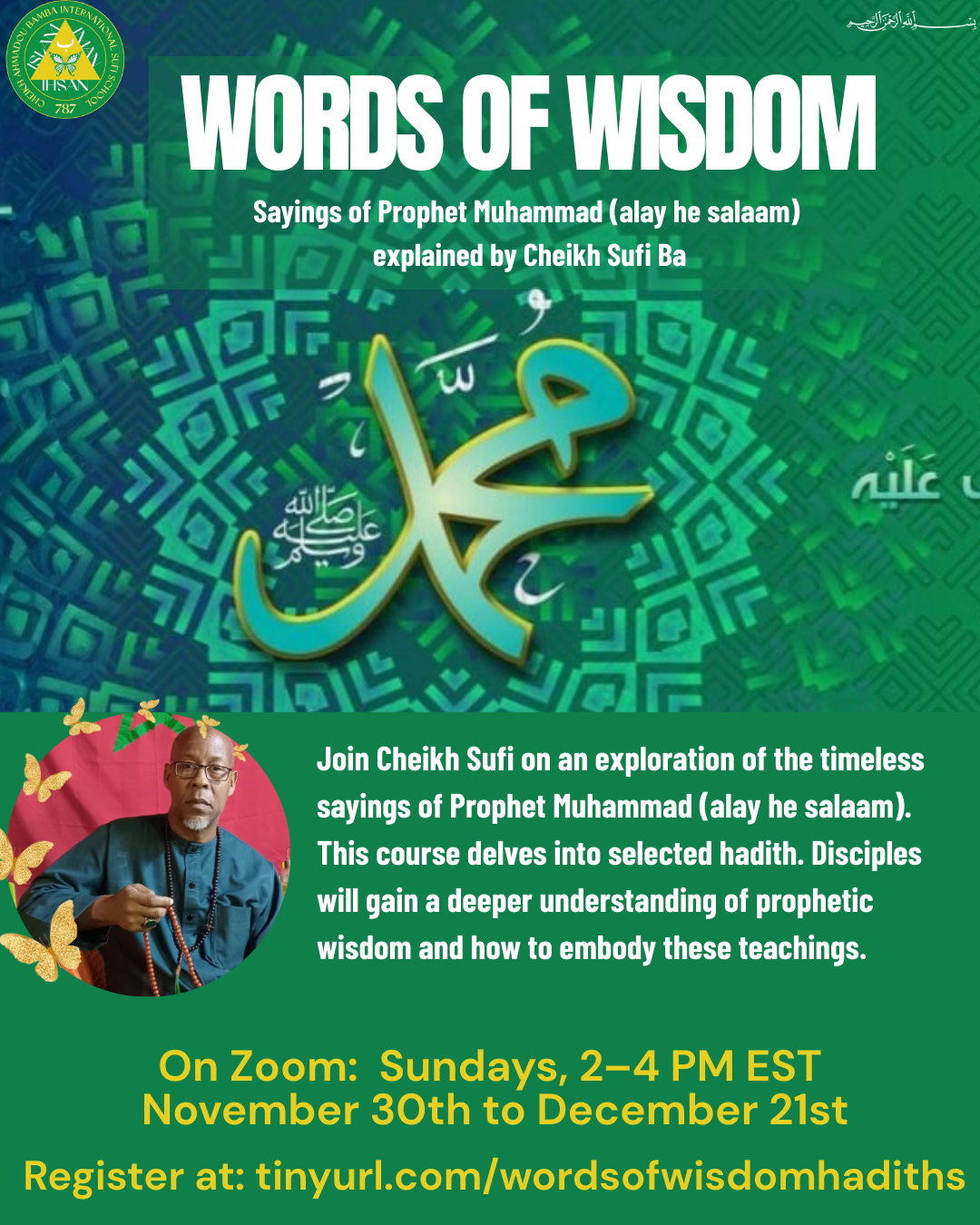 Join Cheikh Sufi on an exploration of the timeless sayings of Prophet Muhammad (alayhi s-salam). This course delves into selected hadith. Disciples will gain a deeper understanding of prophetic wisdom and how to embody these teachings.